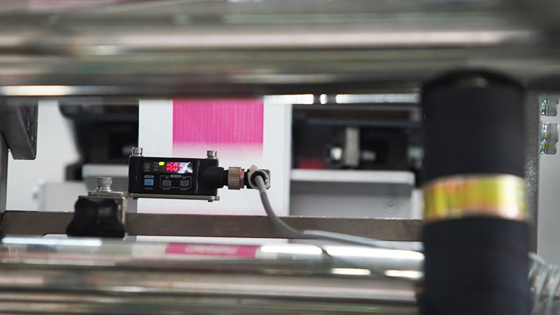 - В транспортировочном блоке установлен фотоэлектрический датчик обнаружения, который подает сигнал тревоги и останавливает процесс изготовления мешков, если транспортировка идет неправильно.